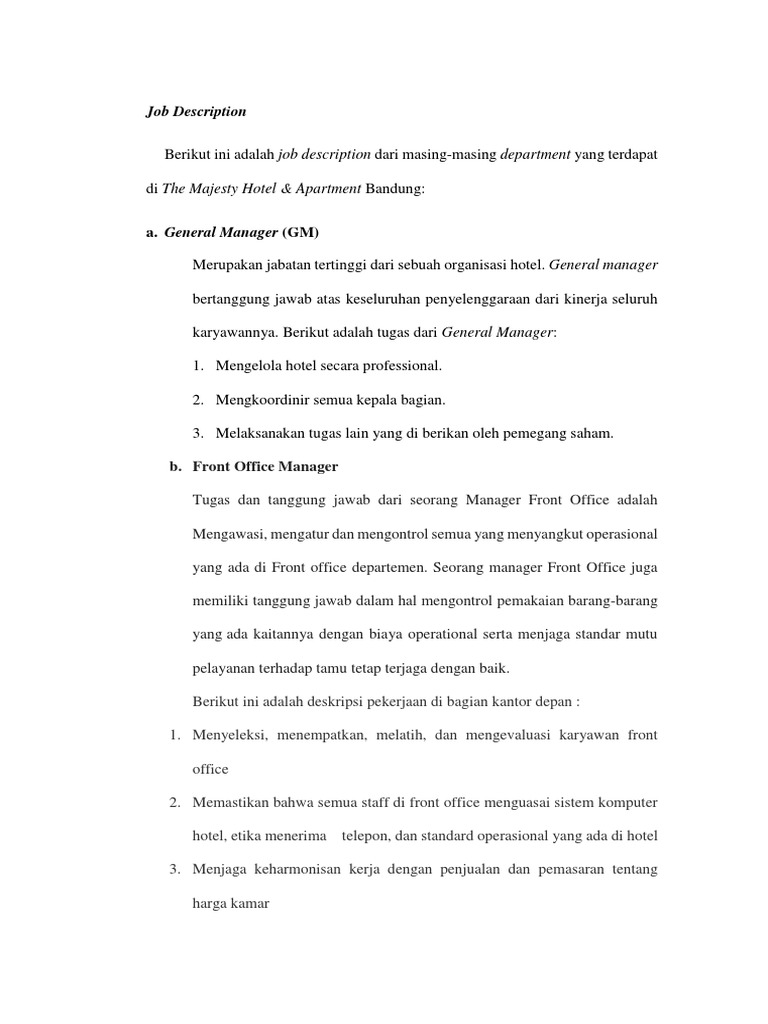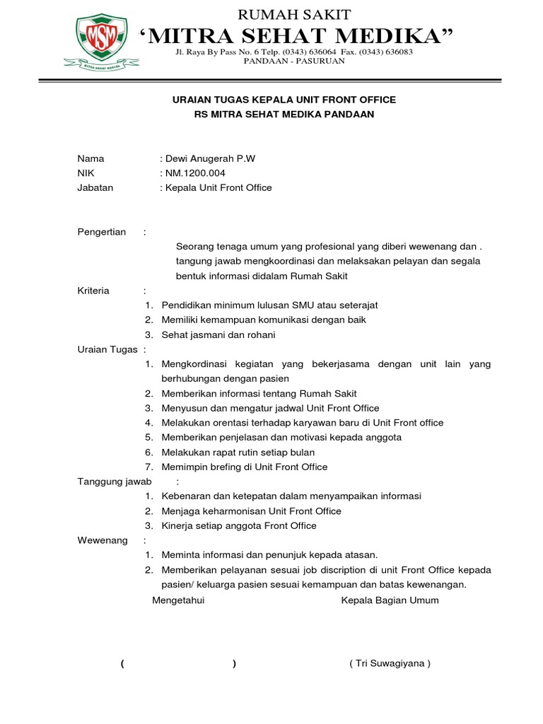 Uraian Tugas Kepala Unit Front Office Pdf